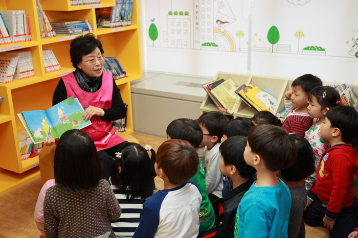 ▲ 가양1동에 위치한 도란도란 작은 도서관에서 노인 자원봉사자가 아이들에게 동화책을 읽어주는 모습.