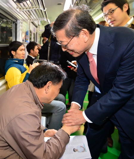 6.4 지방선거 서울시장 출마를 선언한 김황식 전 국무총리가 18일 오후 서울 지하철 2호선 동대문역사문화공원역에서 지하철에 올라 구의역으로 이동하며 시민들과 대화를 나누고 있다.