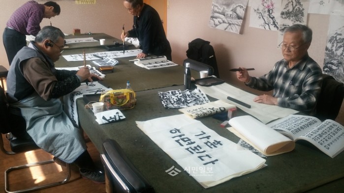 경기 동두천시 생연2동 주민센터가 건전한 가족문화를 되살리고 화목한 가정을 만드는데 도움을 주기 위해 주민센터 방문객 중 희망자들을 대상으로 가훈을 써주는 '무료 가훈 써주기'를 진행 중이다. 사진은 지난 18일 가훈을 써주는 주민센터 서예교실 수강생의 모습.