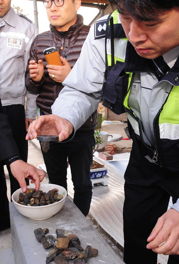 18일 전북 고창에서 운석으로 추정되는 물체를 무더기로 발견했다는 신고가 접수돼 비상한 관심을 끌고 있다. 흥덕면에 사는 고모(55)씨는 전날 동림저수지 제방 인근에서 운석으로 보이는 2~3cm 크기의 암석 30여개를 주웠다고 고창경찰서 흥덕지소에 신고했다. 신고를 받고 출동한 경찰관이 동그란 자석을 운석추정 암석에 갖다 대자 암석이 자석에 달라붙었다.
