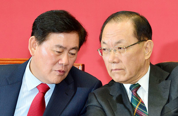 새누리당 황우여(오른쪽) 대표와 최경환 원내대표가 19일 오전 서울 여의도 국회에서 열린 최고중진연석회의에서 대화를 나누고 있다.