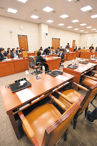 19일 오후 야당 단독으로 국회 법제사법위원회 전체회의가 열린 서울 여의도 국회 법사위 회의실에서 야당 의원들이 서울시 공무원 간첩증거조작사건에 대한 대책을 논의하고 있다.
