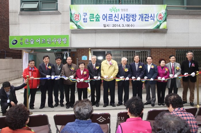 지난 19일 영등포구가 '경로당 현대화 사업'의 일환으로 대림2동 제3경로당을 새로운 건물로 이전·리모델링 완료와 함께 '구립 큰숲 경로당'으로 이름을 바꾸고 개관식을 했다. 사진은 '큰숲 어르신사랑방'의 개관을 기념하며 테이프 커팅을 하고 있는 구청장과 관계자들의 모습.