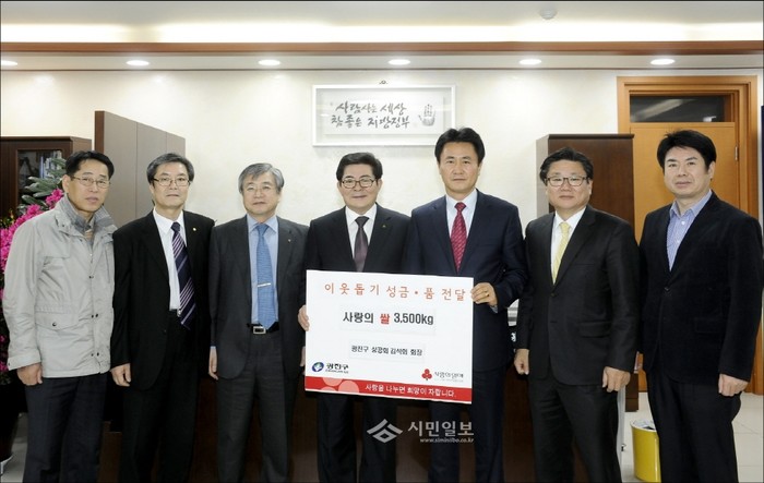 지난 19일 서울 광진구는 광진구상공회로부터 쌀 3500kg을 지역내 소외된 이웃에 전해달라며 기증받았다. 한편 상공회는 별도로 1500kg을 적십자사 등에 기부했다. 사진은 이날 기증식에 참여한 김기동 구청장, 김석회 광진구상공회장과 관계자들의 모습.