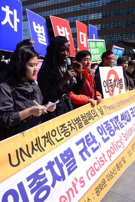 공익법센터 어필과 외국인 이주·노동운동협의회 등 시민단체 회원들이 유엔 세계 인종차별 철폐의 날을 하루 앞두고 20일 오전 서울 광화문 광장에서 정부의 인종차별을 규탄하는 기자회견을 하고 있다.