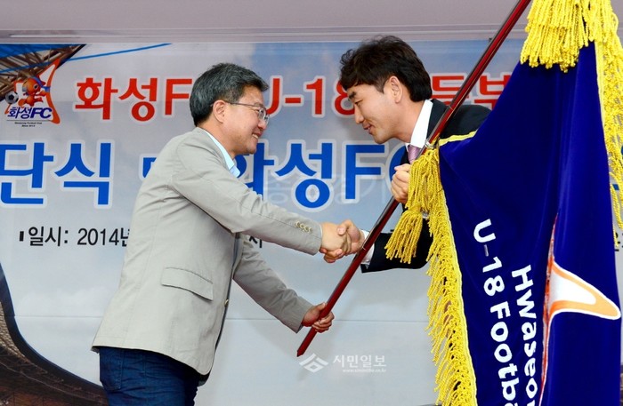 경기 화성시는 지난 19일 지역 축구 유망주 육성과 축구 활성화를 위한 18세 이하 축구 클럽팀 '화성 FC U-18'을 창단했다. 사진은 '화성 FC U-18'의 구단주인 채인석 화성시장(좌측)이 구단 관계자에게 깃발을 전달하는 모습.
