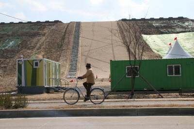 21일 경기 여주시 대신면 양촌리 4대강 사업으로 조성된 남한강 자전거길 옆 양촌적치장에 모래언덕 한가운데 높이 31m에 폭 18m, 길이 55m 규모의 모래썰매장(사진)이 조성됐다. 비가 오거나 한번 이용하면 모래가 쓸려 내려가 수시로 슬로프를 복구해야 하는 등 관리에 연간 1억2000만원의 예산이 투입돼 혈세낭비 논란이 일고 있다.