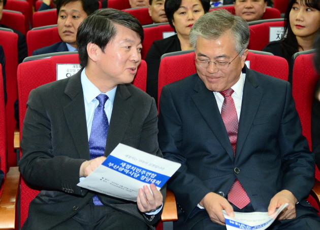 22일 오후 부산 부산진구 부산상공회의소 1층 대강당에서 열린 새정치민주연합 부산시당 창당대회에 참가한 안철수 공동창당준비위원장이 문재인 의원과 나란히 앉아 대화를 하고 있다.