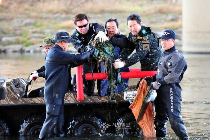 지난 21일 서울 송파구는 '세계 물의날'을 맞아 2014 물과 에너지라는 주제로 '생태경관보전지역'에서 탄천 집중정화활동을 펼쳤다. 사진은 수륙양용차를 이용한 수중정화 작업을 통해 하천의 노폐물을 건져 올리고 있는 관계자들의 모습.