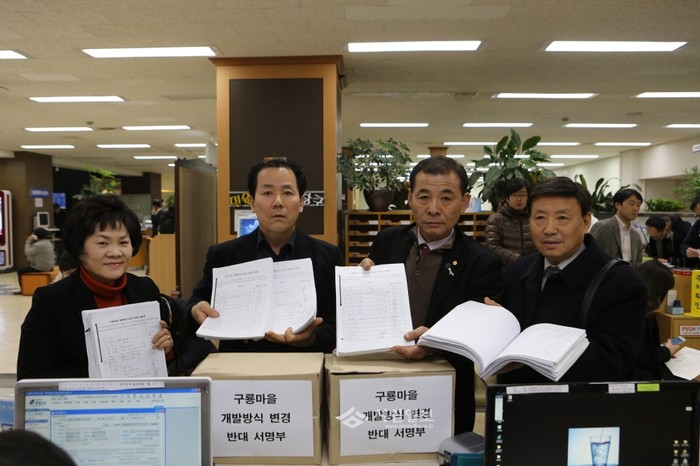 최근 서울 강남구 주민자치위원장 연합회가 구룡마을은 환지방식을 포함하지 말고 100% 수용사용방식으로 개발해야 한다고 주장하는 지역 주민 4만3600명의 서명을 강남구에 제출했다. 사진은 장영칠 연합회장(오른쪽에서 두번째)과 관계자들이 서명서를 들어보이고 있는 모습.