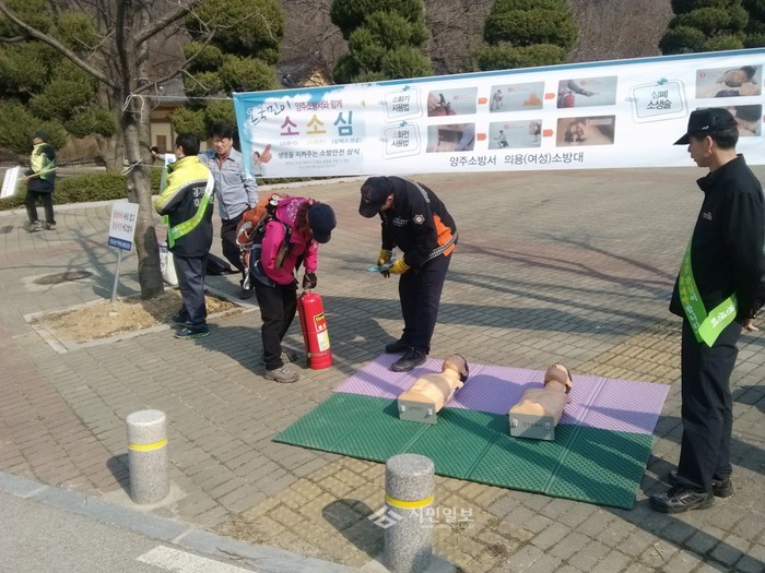 지난 22일 경기 양주소방서가 지역내 불곡산, 북한산, 감악산 일대에서 봄철 산불을 예방하고 안전사고 방지를 위해 소화기, 소화전, 심폐소생술 익히기 캠페인을 펼쳤다. 사진은 이날 소방서 관계자가 등산객에게 소화기 사용법을 알려주는 모습.