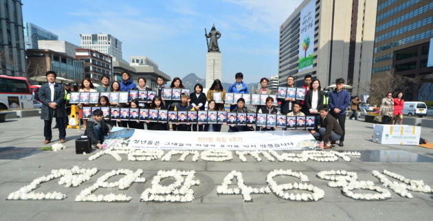미래를 여는 청년포럼 회원들이 24일 오후 서울 종로구 세종대로 광화문광장에서 열린 천안함 4주기 추모 기자회견을 열고 추모 퍼포먼스를 하고 있다.