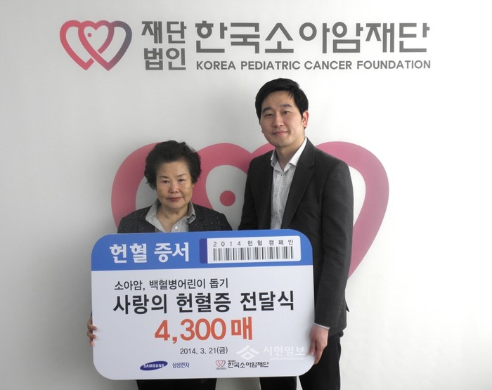 서울 중구의 (재)한국소아암재단은 지난 21일 '사랑의 헌혈증 전달식'에서 삼성전자 DS부문 임직원들이 모은 헌혈증서 4300장을 전달받았다. 재단은 이날 받은 헌혈증을 소아암·백혈병 투병 어린이돕기에 사용할 예정이다.