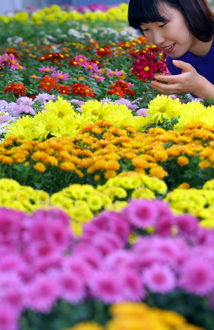 24일 경기 화성 경기도 농업기술원에서 봄, 여름, 가을, 겨울 어느 계절에도 재배 가능한 분화 국화 신품종을 한 시민이 살펴보고 있다.