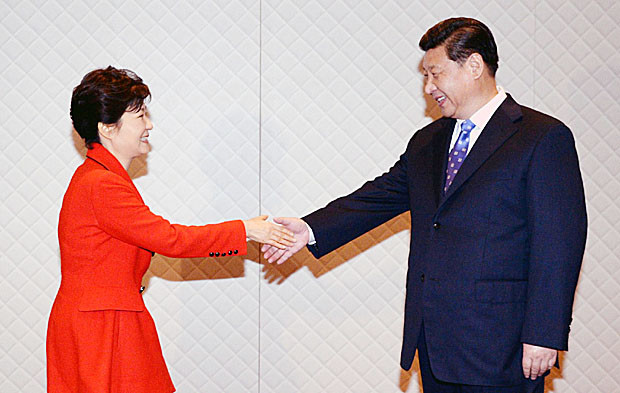 2014 헤이그 핵안보정상회의에 참석하기 위해 네덜란드를 방문한 박근혜 대통령이 23일 오후(현지시간) 네덜란드 암스테르담 안지시 반 오란제 호텔에서 시진핑 중국주석과 정상회담을 하기 위해 악수를 하고 있다.