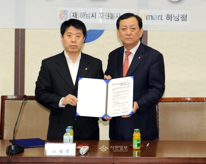 경기 하남시자원봉사센터와 이마트는 지난 21일 지역사회 소외계층 지원을 위해 '희망나눔 프로젝트'의 원활한 추진과 봉사활동 지원 및 물품 후원을 내용으로 담은 '업무협약'을 시청 상황실에서 체결했다. 사진은 이교범 하남시장(오른쪽)과 조홍근 이마트 하남점장(왼쪽)의 모습.