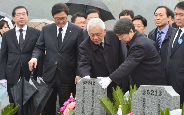 새정치민주연합 김한길(왼쪽), 안철수 공동창당준비위원장이 26일 오전 대전 유성구 국립대전현충원에서 열린 천안함 용사 4주기 추모식에 앞서 천안함 용사 묘역에 참배하고 묘비를 만지고 있다.
