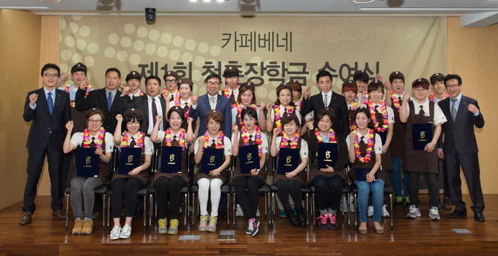 장학금 전달식은 카페베네 김재일 총괄사장을 비롯한 주요 임직원과 장학금을 전달 받을 23명의 학생들이 참석했다. 아르바이트생들에게 장학금을 전달한 김재일 총괄사장은 “지금의 카페베네가 성장하기까지 전국의 각 매장에서 함께한 아르바이트 학생들의 숨은 노고가 있었다는 것을 잘 알고 있다”며 “이 청년들이 카페베네 매장에서 얻은 작은 사회 경험들을 바탕으로 큰 사회에서 활약할 수 있는 훌륭한 인재로 성장하기를 희망한다”고 말했다.