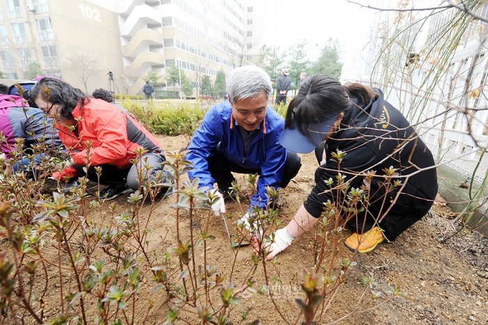 경기 오산시는 지난 26일 ‘제69회 식목일’을 앞두고 지구 온난화의 방지와 자연에 대한 시민 의식 고취를 위해 등산로 및 공원 등지에서 산철쭉, 자산홍, 산수유 등을 식재하는 ‘나무심기 행사’를 했다. 사진은 이날 행사에 참석해 초평동 이림아파트에서 나무심기에 나선 곽상욱 오산시장의 모습.(사진제공=오산시청)