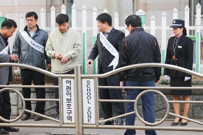 27일 오전 인천시 계양구 화전초등학교 인근 어린이보호구역내에서 실시한 '시민단체와 연계한 교통사고 줄이기 교통안전 캠페인'에 계양경찰서, 녹색어머니연합회, 화전초등학교 교사 등 70여명이 참여했다. 사진은 관계자들과 박형우 계양구청장(가운데)이 학교 주변을 직접 순찰하며 점검하는 모습.