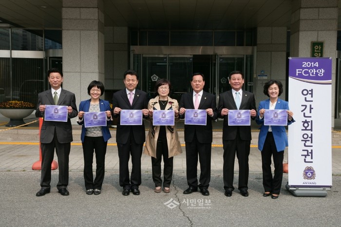 경기 안양시의회 민주당 의원들은 27일 시의회청사 앞에서 시민구단 FC안양의 흥행과 발전을 위해 '2014년 연간회원권 구입식 행사'를 가졌다. 사진은 (왼쪽부터) 방극채·김선화·김성수·송현주·문수곤·임문택·홍춘희 의원.(사진제공=안양시의회)