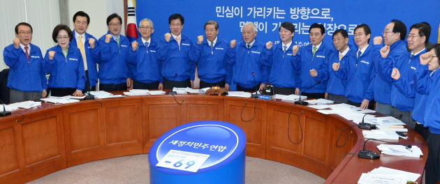 27일 오전 서울 여의도 국회에서 열린 새정치민주연합 첫 최고위원회의에서 김한길, 안철수 공동대표와 전병헌 원내대표 등 최고위원들이 새정치민주연합이 새겨진 옷으로 환복한 뒤 파이팅을 외치고 있다. 왼쪽부터 표철수, 박혜자, 김효석, 우원식, 이용경, 신경민, 김근 최고위원, 김한길, 안철수 공동대표, 전병헌 원내대표, 오홍근, 조경태, 이계안, 양승조, 김삼화, 정연호 최고위원.