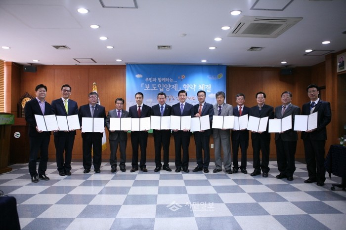지난 27일 서울 강동구가 12개 기업들과 보도 입양자는 3년간 보도청소·보수·쉼터 및 화단조성 등을 구청은 입양 안내 표지석 설치하고 보행자 사고 처리 등의 행정지원을 한다는 내용의 ‘보도입양제 협약’을 체결했다. 사진은 구청에서 관계자들이 협약 체결 기념촬영을 하고 있는 모습.