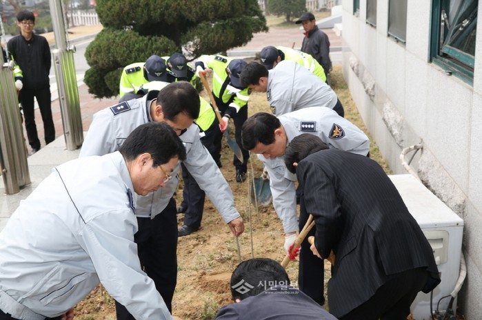 경기 이천경찰서는 지난 28일 오전 이천경찰서 앞에서 식목일을 맞아 식목행사를 실시했다. 이날 식목행사는 임국빈 경찰서장, 경찰관, 의무경찰 등 약 70여명이 참가했으며 대한민국의 국화 무궁화 묘목 100주를 경찰서 화단에 식재했다. (사진제공=이천경찰서)