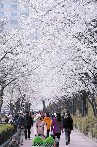 완연한 봄 날씨를 보이는 30일 오전 서울 송파구 석촌호수에서 시민들이 만개한 벚꽃을 보며 산책을 하고 있다.