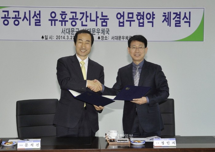 서울 서대문구는 지난달 27일 '착한공간나눔 릴레이'의 일환으로 서대문 우체국과 지상 주차장·휴게 공간 상시 개방을 내용으로 하는 '공공시설 유휴공간나눔 업무협약'을 맺었다. 사진은 이날 협약식에 참석한 문석진 구청장과 정인지 서대문 우체국장의 기념촬영 모습. (사진제공=서대문구청)