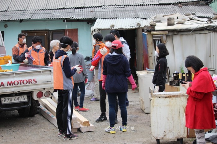 지난달 29일 (자)용인시 자원봉사센터는 집수리 전문 자원봉사단 '행복을 같이하는 사람들'과 함께 삼성전자·경기방송 등의 후원을 받아 지역내 홀몸노인 가구 2곳의 지붕 수리와 도배 공사 등을 실시했다. 사진은 이날 참여한 봉사자들이 집수리를 위해 준비 중인 모습. (사진제공=용인시청)