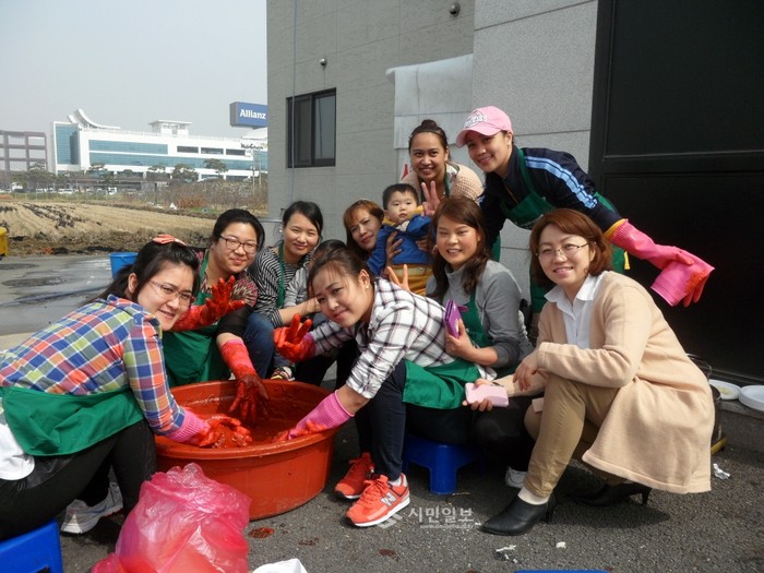 지난달28일 경기 오산시 새마을부녀회가 회관 주차장에서 부녀회원 50여명과 지역내 결혼 이주여성 10명과 함께 우리 고유의 전통 고추장 담그기 체험의 기회를 제공하는 전통 재래 고추장 담그기 행사를 열었다. 사진은 이날 행사에 참여한 관계자들과 다문화가정 여성들이 기념촬영을 하는 모습. (사진제공= 오산시청)