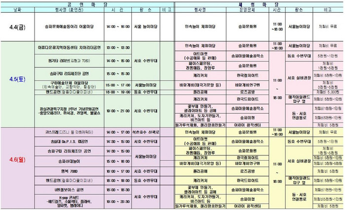 | 석촌호수 벚꽃축제의 공연마당 및 체험마당 일정 | ||