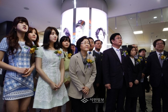 지난달 31일 서울 강남구 압구정로데오역에서 구 관계자들과 카라의 한승연, 레인보우, 에이젝스 등 가수들이 참여해 상시 기부가 가능한 'G+스타존 시즌 3'의 개소식을 했다. 사진은 이날 행사에 홍보대사로 참여한 가수들과 신연희 구청장(왼쪽에서 세 번째)이 시설을 둘러보고 있는 모습. (사진제공= 강남구청)
