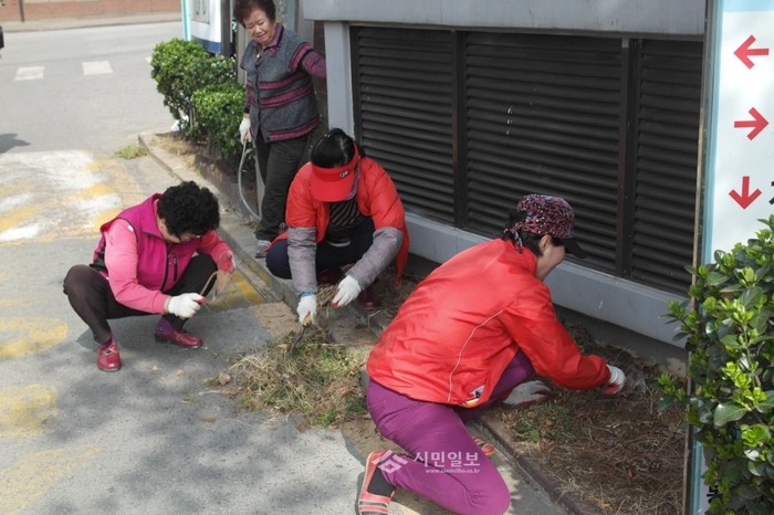 지난달 31일 충남 아산시 온양4동의 동아 아파트 부녀회가 마을 주민들과 함께 아파트 주변 골목길과 주말농장 주변 대청소를 실시해 1톤가량의 쓰레기를 수거하고 잡초를 제거하는 환경정화 활동을 했다. 사진은 이날 활동에 참여한 주민들이 잡초를 제거 중인 모습. (사진제공=아산시청)