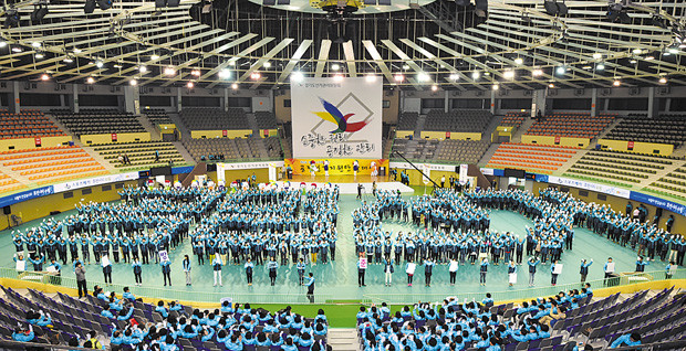 1일 오전 경기 수원실내체육관에서 열린 6.4지방선거 경기도선거관리위원회 공정선거지원단 발대식에서 900여명의 단원들이 ‘공명선거’ 문구를 만들고 있다.
