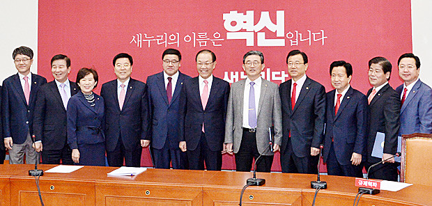새누리당 황우여 대표가 1일 오전 서울 여의도 국회 대표최고위원실에서 열린 경제혁신특별위원회 위원장 임명장 수여식을 마친 뒤 이한구 위원장을 비롯한 의원들이 기념촬영을 하고 있다.