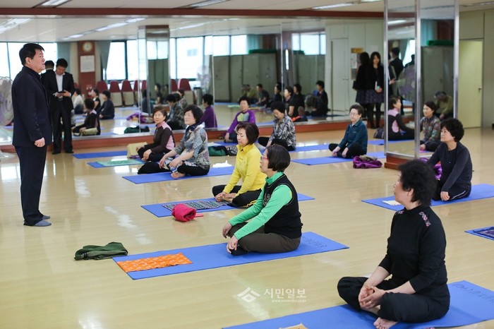 지난 1일 인천 계양구가 구청 생활체육관에서 지역주민의 체력 증진과 건강하고 활기찬 생활을 위한 무료 생활체육 프로그램인 '7330생활체육아카데미 노인건강체조교실'을 진행했다. 사진은 실버요가 프로그램에 참여한 지역주민들의 모습. (사진제공=계양구청)