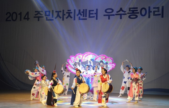 지난 1일 경기 하남시가 문화예술회관 검단홀에서 지역내 동아리 회원들과 시민 600여명이 참여한 '주민자치센터 우수동아리 경진대회'를 열고 주민자치센터를 통해 그동안 갈고닦은 실력을 선보였다. 사진은 이날 최우수상을 받은 신장1동 까투리 무용팀의 '장수춤' 공연 모습. (사진세공=하남시청)
