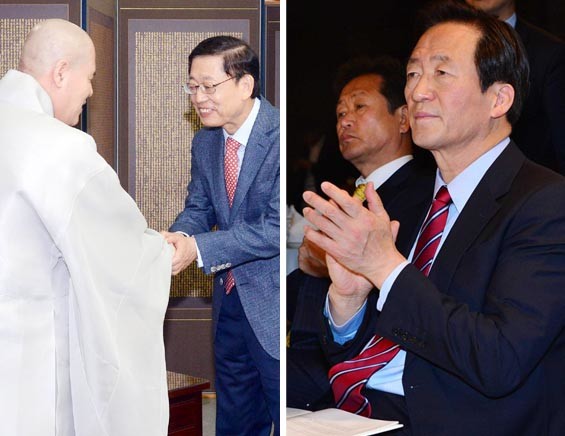 새누리당 서울시장 경선 후보인 김황식 전 국무총리가 2일 오전 서울 종로구 견지동 대한불교조계종 총무원을 예방해 자승 총무원장과 악수를 나누고 있다. 같은 날 정몽준 새누리당 서울시장 예비후보는 서울 종로구 세종문화회관 세종홀에서 열린 한국YMCA 100주년 기념식을 찾았다.