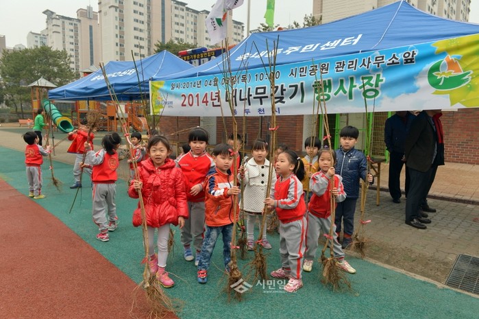 경기 동두천시는 3일 지행동 시민공원 앞에서 제69회 식목일을 기념해 일반 시민들에게 1인당 2주씩, 총 1000명에게 매실나무, 살구나무 두 종류의 유실수묘목 2000여주를 나눠주는 '나무 나눠주기 행사'를 실시했다. 사진은 묘목을 나눠받은 아이들의 모습. (사진제공=동두천시청)
