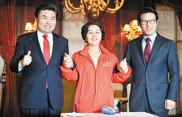 | 3일 오전 서울 여의도 한 레스토랑에서 새누리당 경기도지사 경선 후보인 원유철(왼쪽부터) 의원, 김영선 전 의원, 정병국 의원이 경선 룰 관련 긴급 회동에 앞서 손을 맞잡고 있다. 이날 세 후보는 경기도지사 경선 후보인 남경필 의원을 포함한 후보 4명에서 후보 2명으로 압축해 줄 것을 당에 요구하기로 합의 했다.(사진제공=뉴시스) | ||