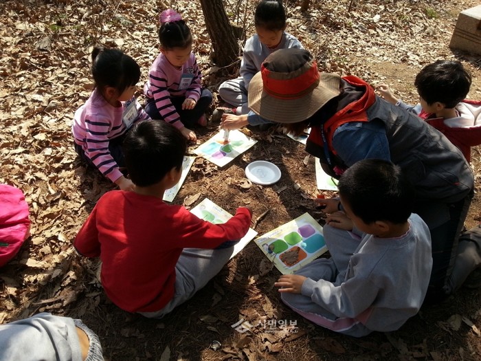 지난 2일 인천 계양구보건소가 지역내 어린이집 원생들을 대상으로 계양산 산림욕장에서 숲 체험 프로그램인 어린이 건강습관 가꾸기 교실 첫 수업을 진행했다. 사진은 이날 자연을 이용한 나만의 건강밥상 차리기 체험교실에 참여한 어린이들의 모습.(사진제공=계양구청)