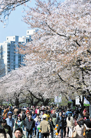 6일 오전 서울 영등포구 여의서로에서 열린 ‘한강 여의도 봄꽃축제’를 찾은 시민들이 벚꽃 등 봄꽃을 감상하며 발걸음을 옮기고 있다.