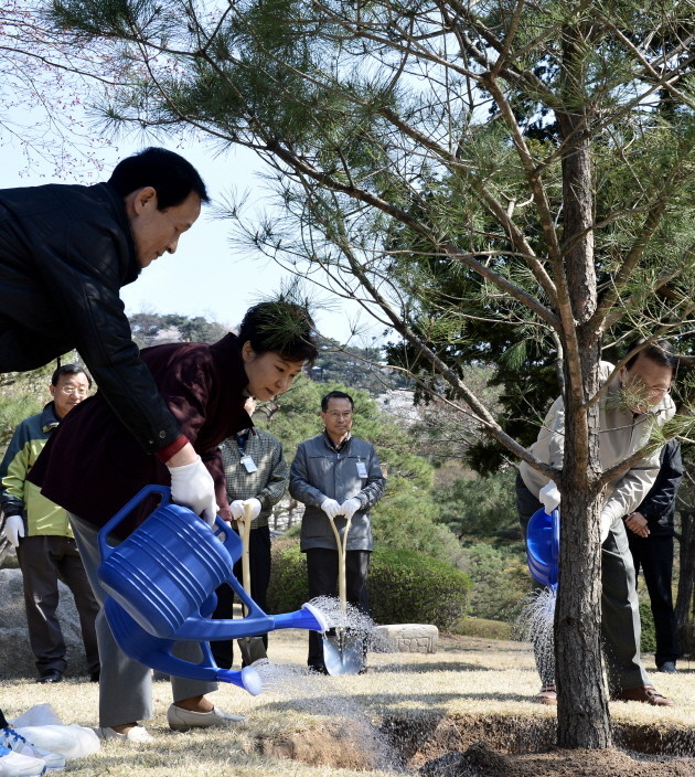 박근혜 대통령이 식목일인 5일 청와대에서 김기춘 비서실장, 김장수 국가안보실장 등 수석들과 정이품송후계목 기념식수 후 물을 주고 있다.