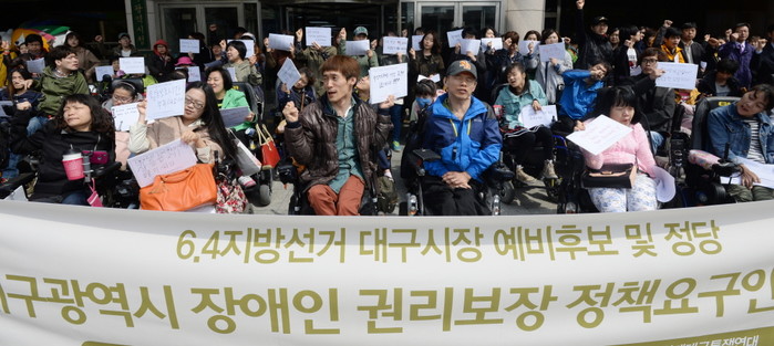420장애인차별대구투쟁연대는 7일 오전 대구시청 앞에서 6.4지방선거 대구시장 예비후보 및 정당관계자들에게 장애인 권리보장 정책요구안을 촉구하는 기자회견을 하고 있다.