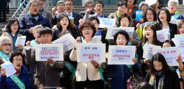 7일 오후 서울 중구 봉래동 서울역 앞에서 대한기독교여자절제회 관계자들이 금주,금연,마약 퇴치 캠페인을 하고 있다.