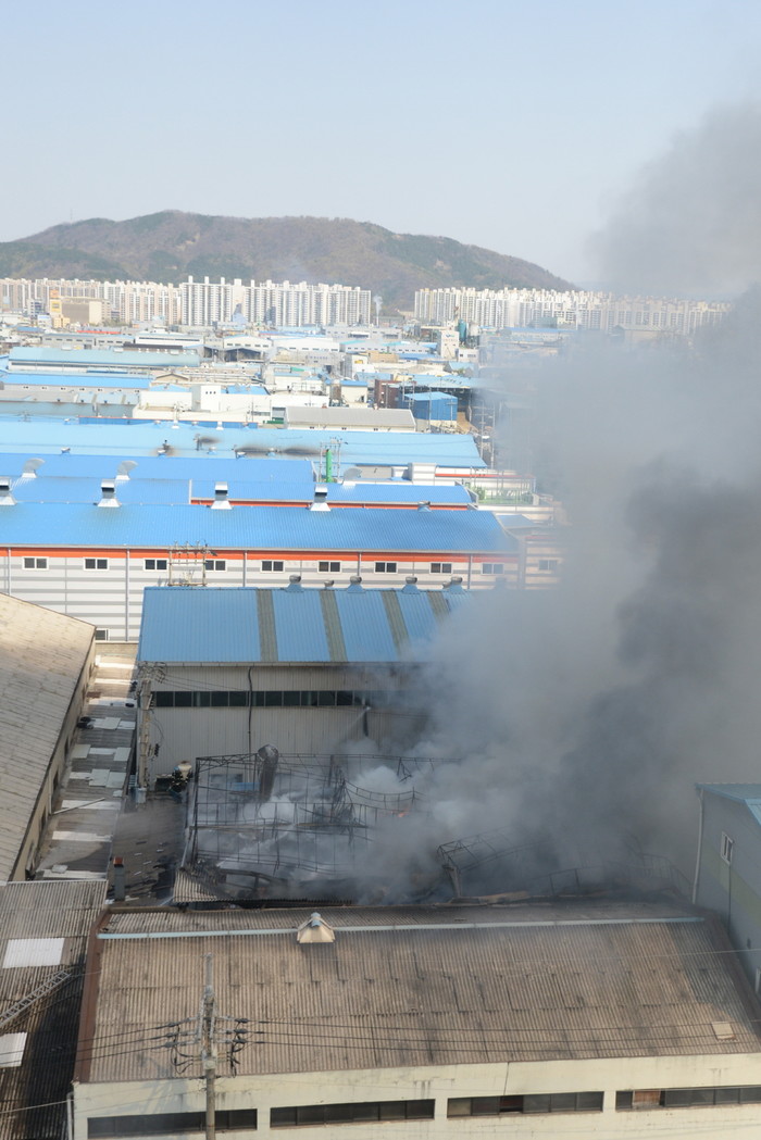 8일 오전 대구 달서구 한 자동차 부품공장에서 화재가 발생해 소방대원 120여명과 40대의 소방차들이 출동해 진화를 하고 있다.