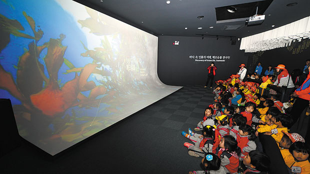 2014 완도국제해조류박람회 개막이 3일 앞으로 다가온 8일 오전 전남 완도군 완도읍 완도항 해조류박람회장에서 팸 투어 행사가 펼쳐졌다. 어린이들이 주제관 해조류 영상관에서 8m 대형스크린을 통해 해조류 영상을 보고 있다. 완도국제해조류박람회는 ‘바다 속 인류의 미래, 해조류를 만나다’라는 주제로 11일부터 내달 11일까지 한달여 동안 열린다.