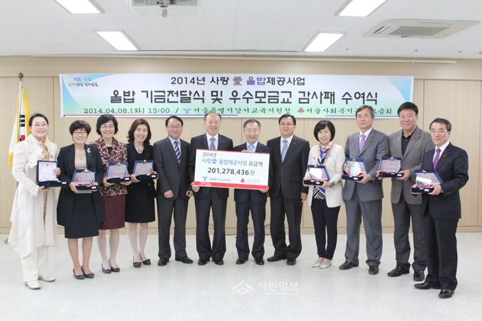 지난 8일 서울특별시강서교육지원청은 서울사회복지공동모금회로부터 저소득층 아동들에게 아침식사를 제공하는 ‘사랑 愛 올밥 제공사업’에 사용할 기금 2억여원을 전달받고 감사패를 수여하는 전달식을 열었다. 사진은 이날 전달식에 참여한 관계자들이 기념촬영을 한 모습.(사진제공=서울사랑의열매)